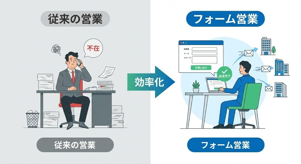 一般的なテレアポや飛び込み営業と比較して、フォーム営業は相手の時間を突然奪うことがありません。電話では担当者不在で断られることが多いですが、フォームなら確実に文章を届けられます。また、一度に複数の企業へアプローチしやすいため、効率性の面で大きく優れています。実際にテレアポから切り替え、アポ獲得率を改善した成功事例も多いです。