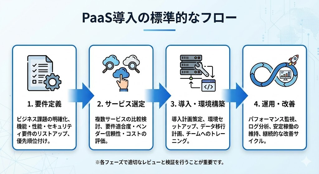 導入の第一歩は、ビジネス課題を明確にし、システムに求める要件を詳細に定義することです。 必要な機能、性能、セキュリティ要件、予算などをリストアップし、優先順位をつけます。 複数のPaaSサービスを比較検討し、要件を最も満たすサービスを候補として絞り込みます。 この段階でベンダーの信頼性や導入実績も調査し、リスクを最小限に抑える選定を行います。