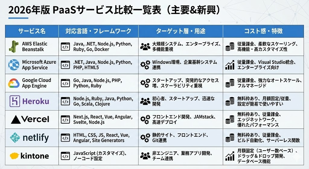 近年では、特定の用途や言語に特化した新興PaaSサービスも注目を集めています。 例えば、フロントエンド開発に特化したVercelやNetlifyなど、フロントエンド向けのホスティング兼PaaSは、高速なデプロイと優れたパフォーマンスを提供します。 国内発のサービスでは、kintoneのような、ローコード型の国産PaaSなどが業務アプリ開発のハードルを下げ、非エンジニアでも活用できる環境を整えています。 これら新興サービスは、従来の汎用型PaaSにはない独自の機能や使いやすさを備え、ニッチなニーズに応えています。