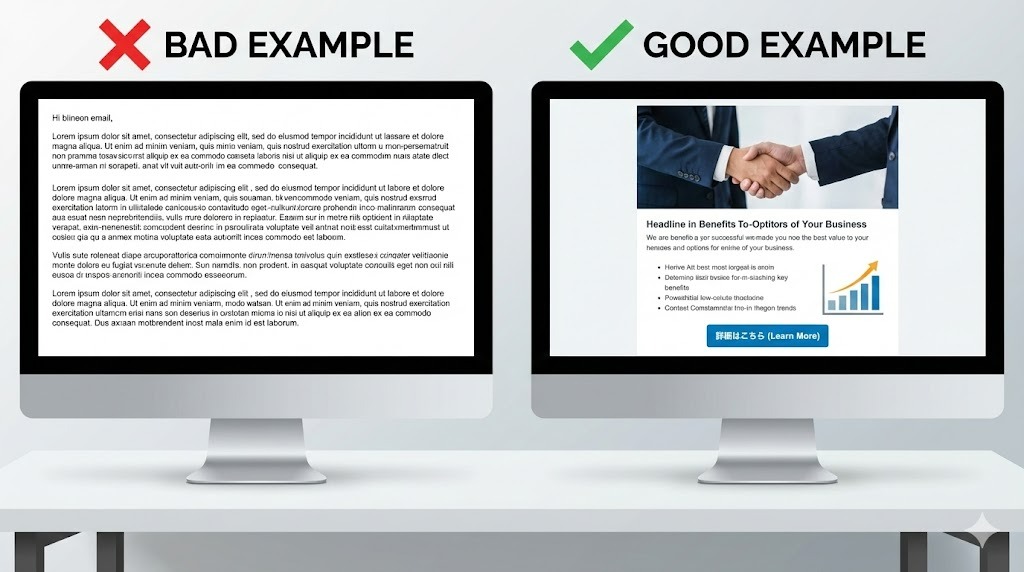 人間は情報の多くを視覚から得ているため、文字ばかりのDMは読まれる前に捨てられる可能性があります。 画像、グラフ、イラストなどを効果的に配置し、直感的に内容が伝わるように工夫してください。 特に商品の魅力や導入効果(Before/Afterなど)は、テキストよりも画像で見せる方が説得力が増します。 重要なポイントを強調枠で囲むなどのメリハリも有効です。