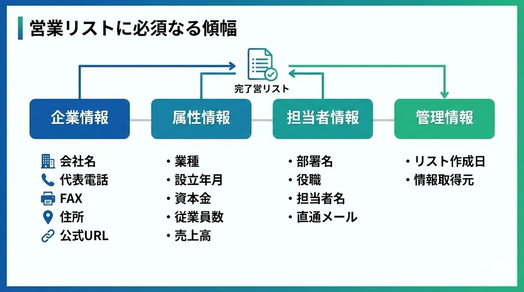 営業リストとは、自社の商品やサービスを提案する見込み客(ターゲット)の情報を一覧化したものです。 具体的には、企業名、電話番号、担当者名、住所、業種などの基本情報が含まれます。