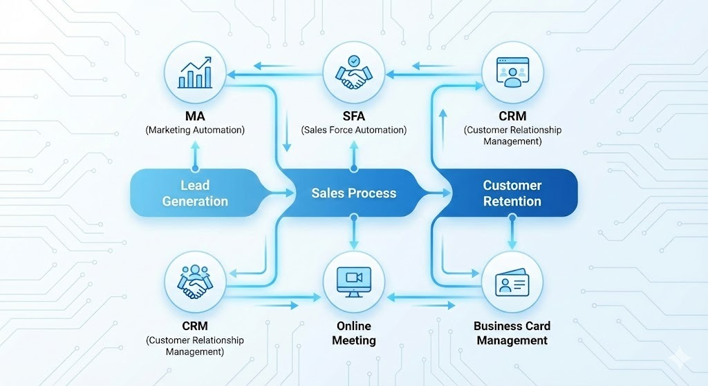 具体的には、顧客データベースを管理するCRMや、営業担当者の行動を支援するSFAなどが代表的です。これらのツールは単なる記録媒体ではなく、蓄積されたデータを分析し、次のアクションを示唆する役割も担っています。