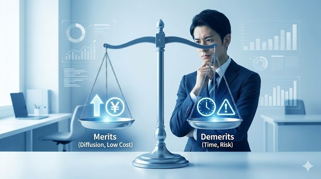 一方で、即効性が低い点はデメリットです。信頼関係の構築には時間がかかるため、開始直後から大きな売上を作るのは困難です。 また、競合も多く参入しているため、差別化されたコンテンツを発信し続けなければ埋もれてしまいます。炎上リスクや、情報の信頼性をどう担保するかという課題もあり、運用リテラシーが求められます。