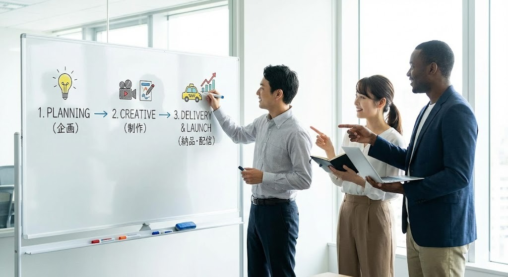 - 納品・配信開始:データを納品し、指定日から掲出が開始される