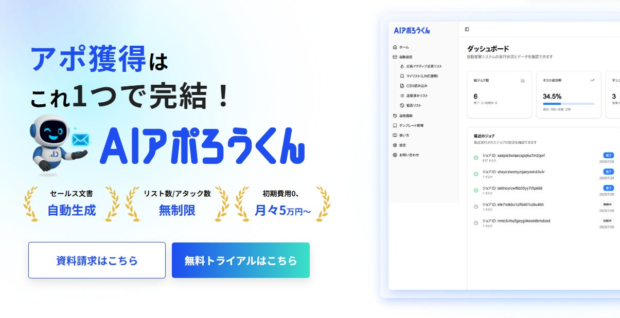 営業活動の効率化が急務となる2025年、従来のテレアポや飛び込み営業に加えて、AIを活用したフォーム営業自動化を検討する企業も増えているでしょう。人手不足や営業コスト削減の課題を抱える企業にとって、AI技術による営業工数の大幅削減と成約率向上は魅力的な解決策です。