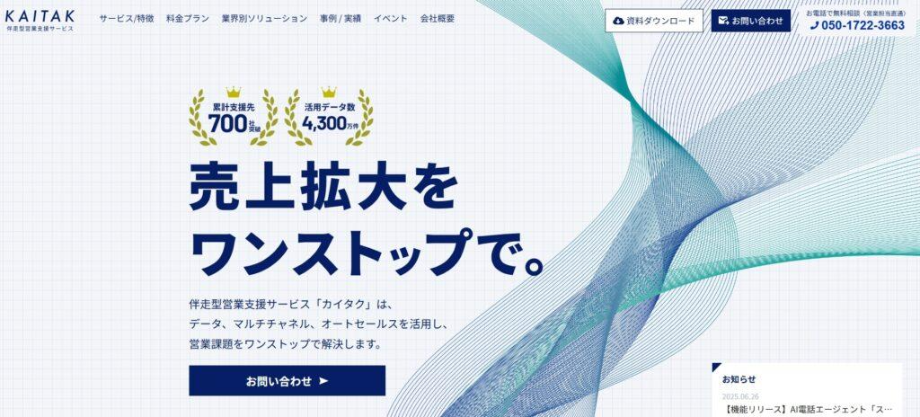 カイタク株式会社が提供するKAITAKは、700社超の支援実績を持つ伴走型営業支援サービスです。リスト作成から営業文面作成、問い合わせフォーム営業まで一貫したサポートを提供し、AIとRPAを活用したフォーム営業自動化で効率的な新規開拓を実現します。特に「カイタクAIコール」では電話業務をワンクリックで自動化し、営業プロセス全体を最適化。人力とAIのハイブリッド型支援により、単なるツール提供ではなく成果にフォーカスした営業戦略設計から実行まで包括的にサポートします。中小企業からスタートアップまで幅広い企業の営業強化を支援しています。